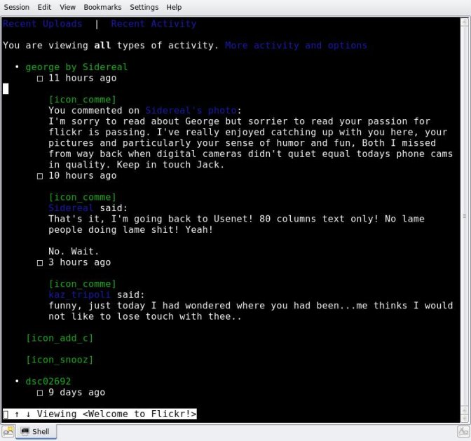 Rappeler également, car on l’oublie trop souvent, la puissance expressive du plain-texte. Je ne reviendrai pas ici sur l’ASCII Art, même si c’est un exemple frappant. Je suis davantage intéressé par la minutie avec laquelle les codeurs (programmeurs ou non) rédigent leur code source, développant de véritables traditions (coding styles) à la fois pratiques et esthétiques dans lesquelles il me semble voir une forme de langage expressif, métalinguistique et poétique — sur laquelle je ne m’attarderai pas davantage ici. Comme toute forme de communication, le plain-texte a subi au fil des décennies une exigence d’expressivité, et certaines traces en sont particulièrement visibles d’un point de vue formel : écrire en capitales signifie que l’on crie, insérer un smiley en fin de phrase dénote un ton ironique, et ainsi de suite.