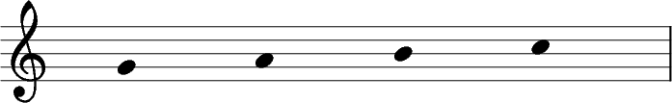 Plaçons un Sol sur ta portée de main droite (la seconde ligne, tu te souviens ?), et écrivons quelques notes en montant, tantôt sur la ligne, tantôt entre les lignes.