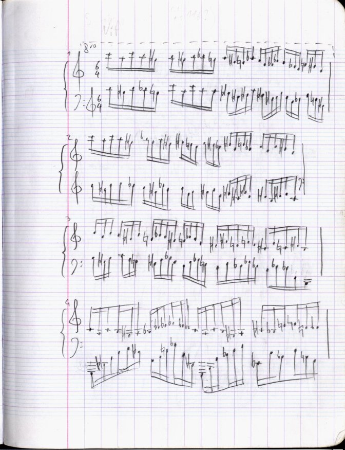 Ces feuilles grossièrement photocopiées se délitaient dès que l’on essayait d’y passer un coup de gomme ; elles accueillirent tant bien que mal, l’année suivante, les six premières pages de ma pièce "Corail" et le premier tiers de mon quatuor à cordes en 2003. Je n’ai, à ce jour, terminé aucune de ces partitions.
